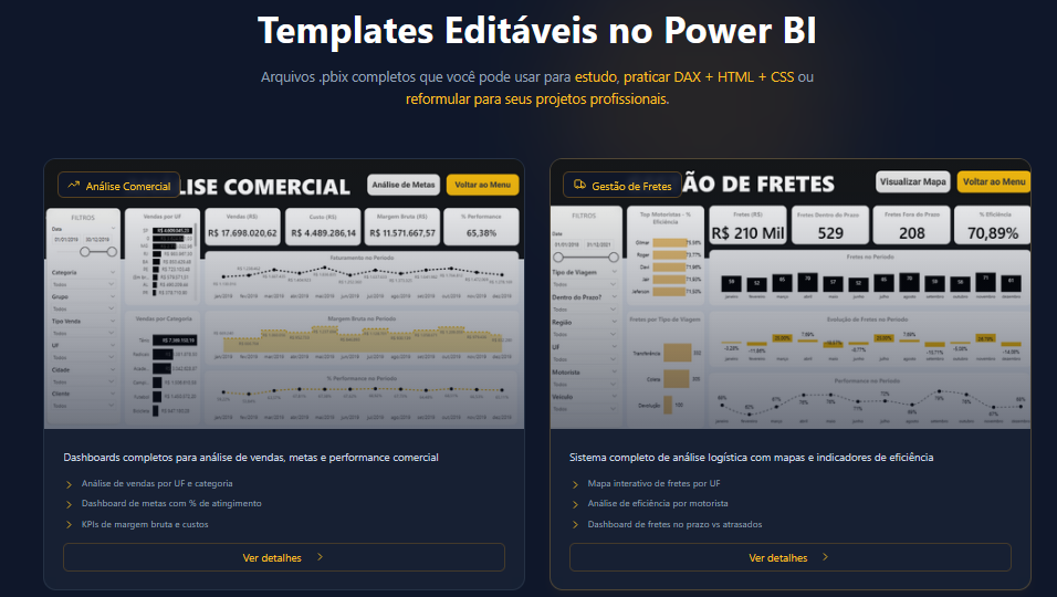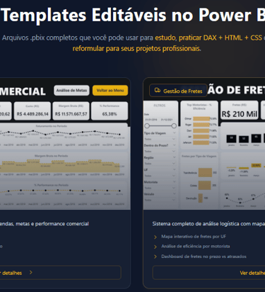 Templates editáveis e documentados no Power BI que você pode usar para estudo, praticar DAX + HTML + CSS ou reformular para seus projetos profissionais